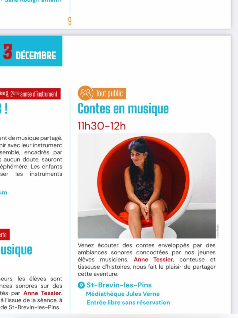 Pendant la Semaine Pas Banale à St Brévin j’ai animé la « dimension contée » de l’atelier Contes&Musique de l’école de musique Sud Estuaire : c’était un régal de musiciens en herbe pleins de talents, sources de trouvailles sonnantes et crépitantes pour l’aventure épique de notre petite grand-mère des contes !!! Avec pour clôture une chaleureuse représentation avec tous les participants à la Médiathèque de St Brévin, c’était une très belle aventure.